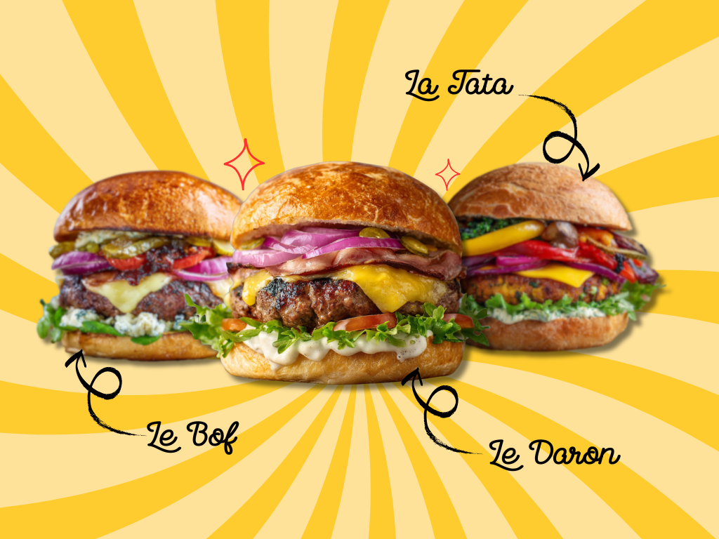 On décline les recettes Daron, Daronne, Beau-Père, Fiston, BOF, Cousine et Cousin en version smash. Mais on propose aussi des recettes différentes que tu vas kiffer avec le French Emmental, le Franchouillard et l’Authentique.