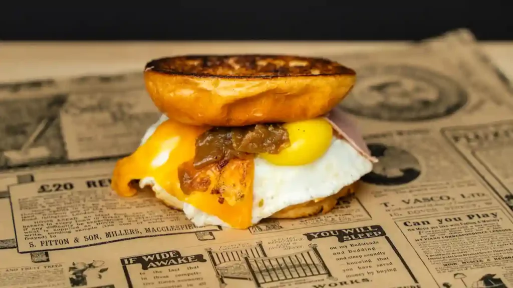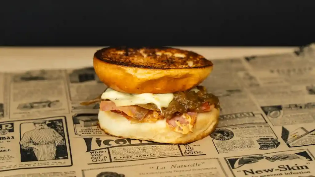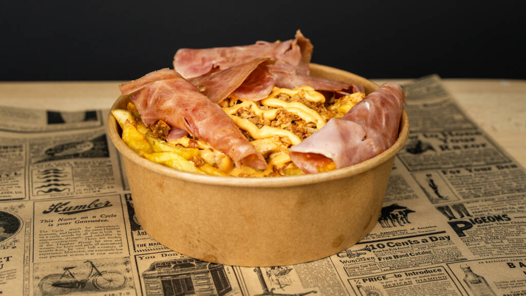 Pain toasté, jambon, œufs, oignons frits, sauce mayonnaise & sauce cheddar